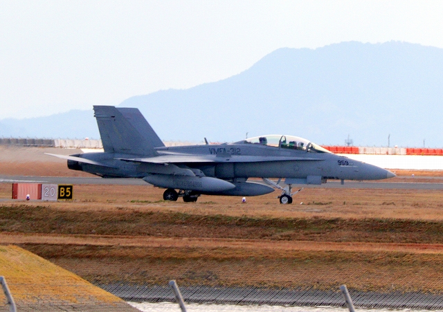 米海兵隊 F/A-18D ホーネット 戦闘攻撃機、959番機(VMFA312)が飛来、着陸 |