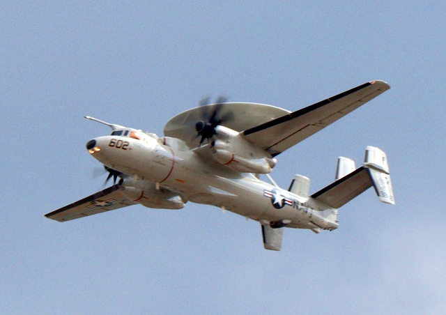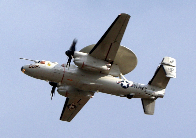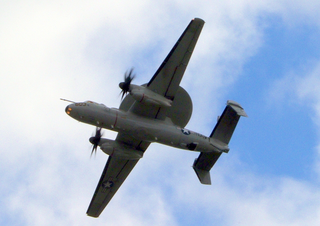 米海軍艦載機 E-2D アドヴァンスド・ホークアイ 早期警戒機(岩国基地)、602番機が旋回 |