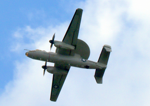 米海軍艦載機 E-2D アドヴァンスド・ホークアイ 早期警戒機(岩国基地)、603番機が旋回 |