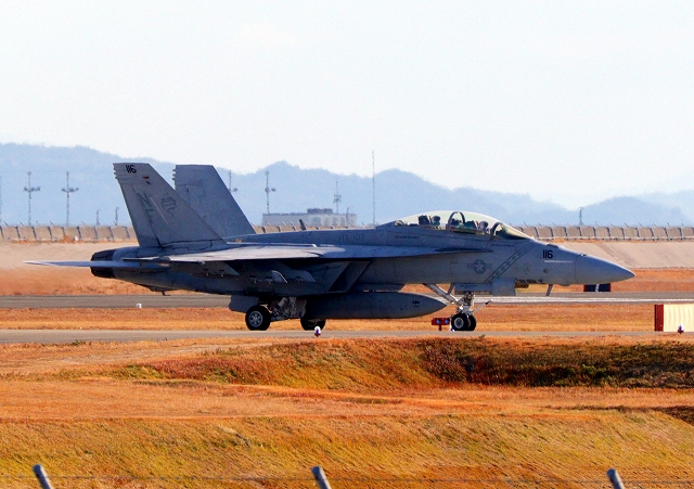 米海軍艦載機 F/A-18F スーパーホーネット 戦闘攻撃機(岩国基地)、NF、116番機が着陸 |