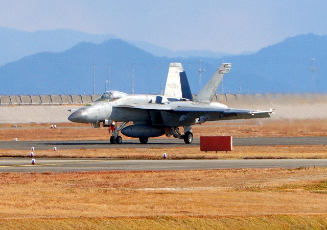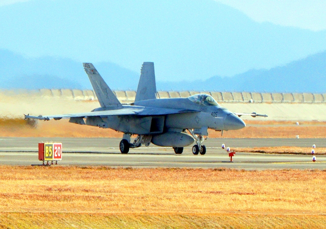 米海軍艦載機 F/A-18E スーパーホーネット 戦闘攻撃機(岩国基地)、NF、405番機が着陸 |