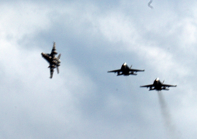 米海兵隊 F/A-18C/D ホーネット 戦闘攻撃機(岩国基地)、DR、214番機、230番機、957番機が3機編隊で帰還 |