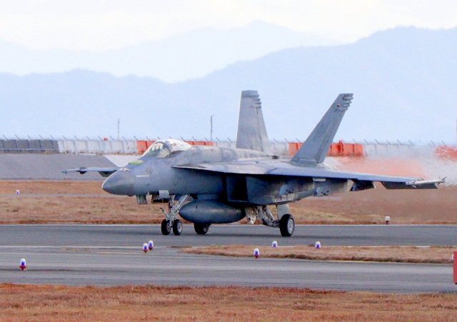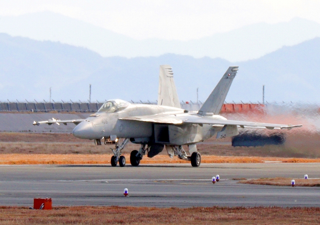 米海軍艦載機 F/A-18E スーパーホーネット 戦闘攻撃機(岩国基地)、NF、410番機が着陸 |