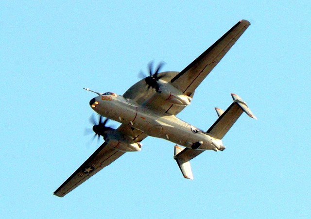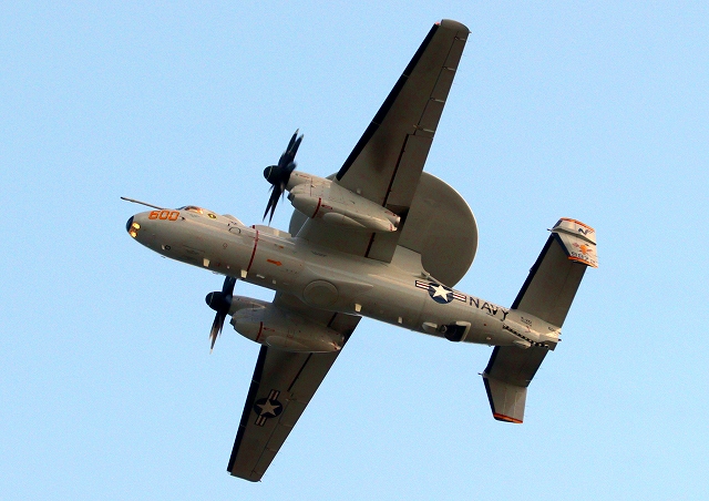 米海軍艦載機 E-2D アドヴァンスド・ホークアイ 早期警戒機(岩国基地)、600番機が旋回 |
