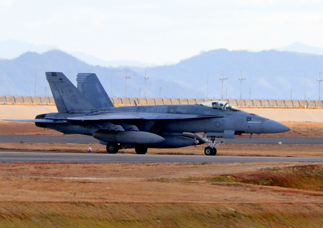 米海軍艦載機 F/A-18E スーパーホーネット 戦闘攻撃機(岩国基地)、NF、211番機が着陸 |