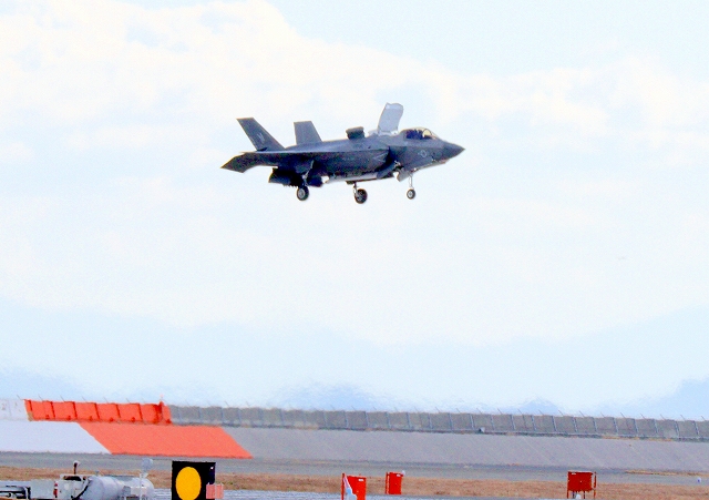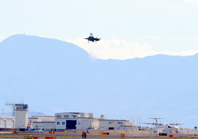米海兵隊 F-35B ライトニングⅡ 戦闘機(岩国基地)、DT、23番機が南側の垂直着陸パッドの方に。 |