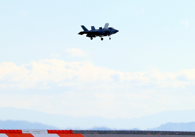 米海兵隊 F-35B ライトニングⅡ 戦闘機(岩国基地)、DT、23番機が南側の垂直着陸パッドの上でホバリング |
