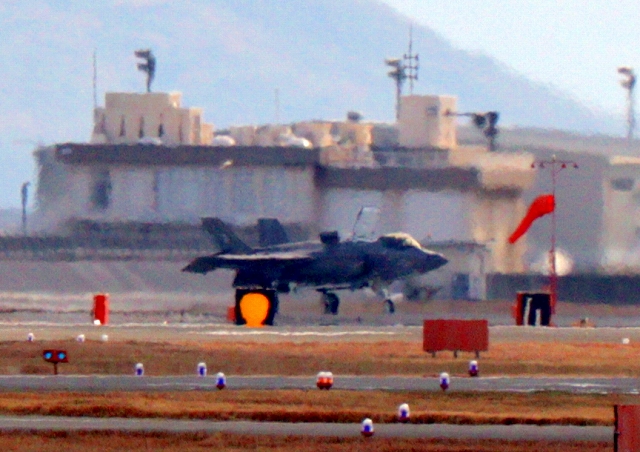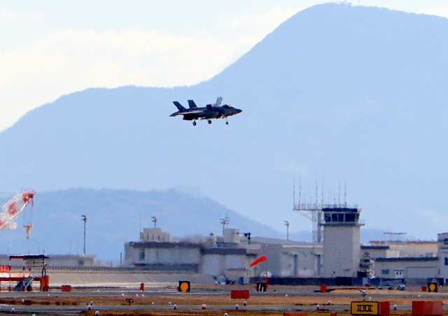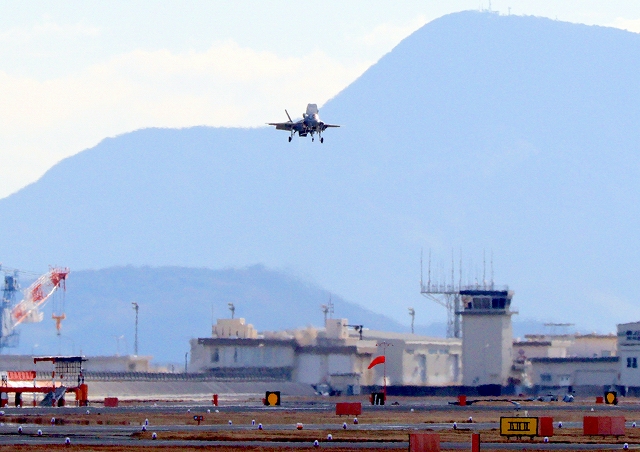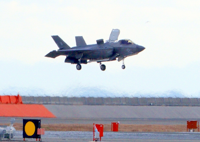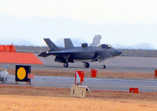 米海兵隊 F-35B ライトニングⅡ 戦闘機(岩国基地)、DT、元01番機は北側の垂直着陸パッドの方に向かいます。 |