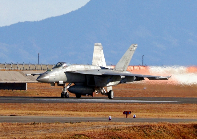 米海軍艦載機 F/A-18E スーパーホーネット 戦闘攻撃機(岩国基地)、NF、410番機が着陸 14時07分に離陸した機。1時間04分の飛行でした。 |