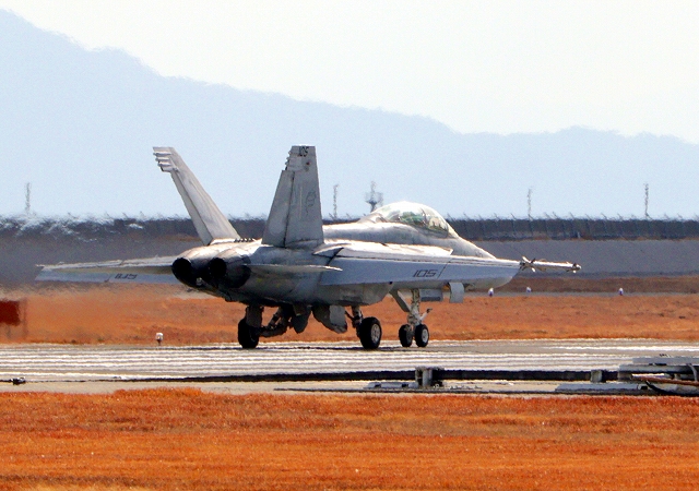 米海軍艦載機 F/A-18F スーパーホーネット 戦闘攻撃機(岩国基地)、NF、105番機が離陸 |