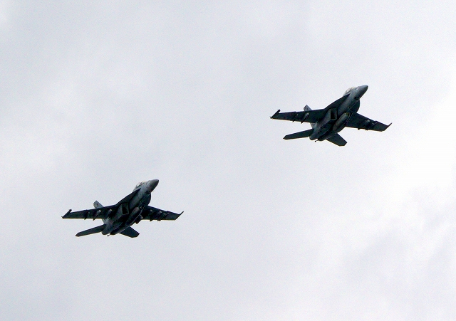 米海軍艦載機 F/A-18F スーパーホーネット 戦闘攻撃機(岩国基地)、NF、100番機、107番機が2機編隊で帰還 |