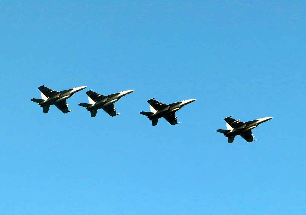 米海軍艦載機 F/A-18E スーパーホーネット 戦闘攻撃機(岩国基地)、NF、407番機、406番機、202番機、201番機が4機編隊で帰還
