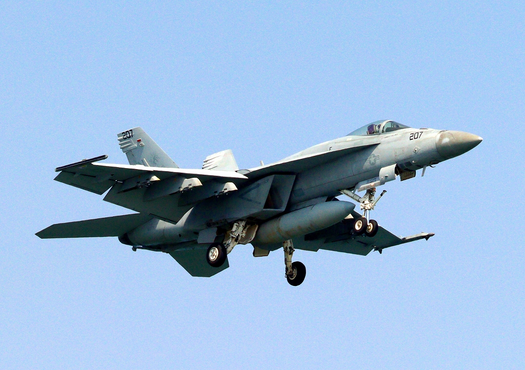 米海軍艦載機 F/A-18F スーパーホーネット 戦闘攻撃機(岩国基地)、E NF、207番機が帰還、着陸
