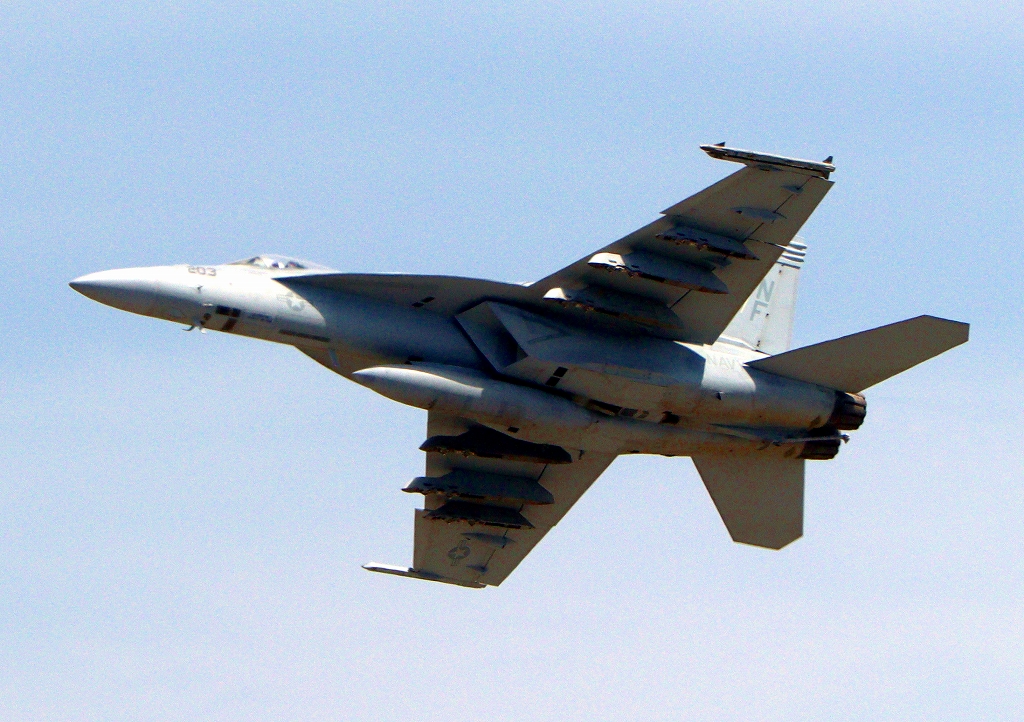 米海軍艦載機 F/A-18E スーパーホーネット 戦闘攻撃機(岩国基地)、NF、203番機が離陸