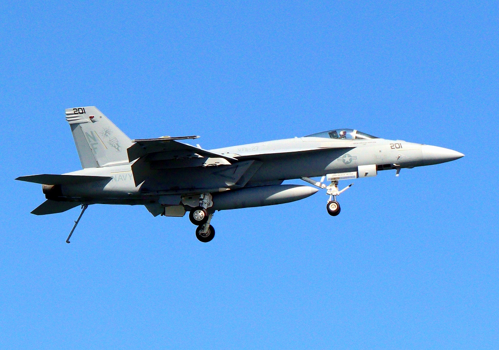 米海軍艦載機 F/A-18E スーパーホーネット 戦闘攻撃機(岩国基地)、NF、201番機が帰還、アレスティング・フック、引っかけて着陸