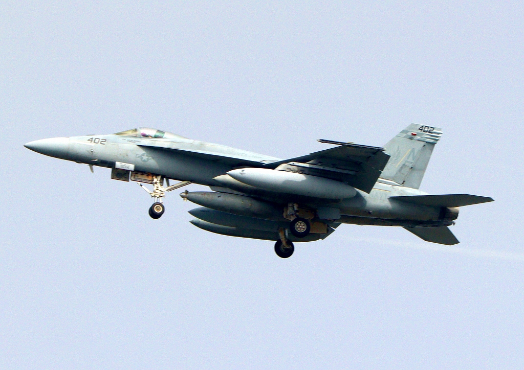 米海軍艦載機 F/A-18E スーパーホーネット 戦闘攻撃機(岩国基地)、NF、402番機が離陸