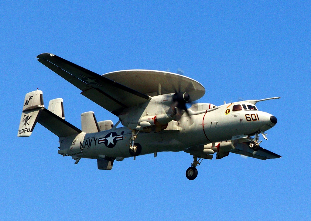 米海軍艦載機 E-2D アドヴァンスド・ホークアイ 早期警戒機(岩国基地)、601番機が帰還