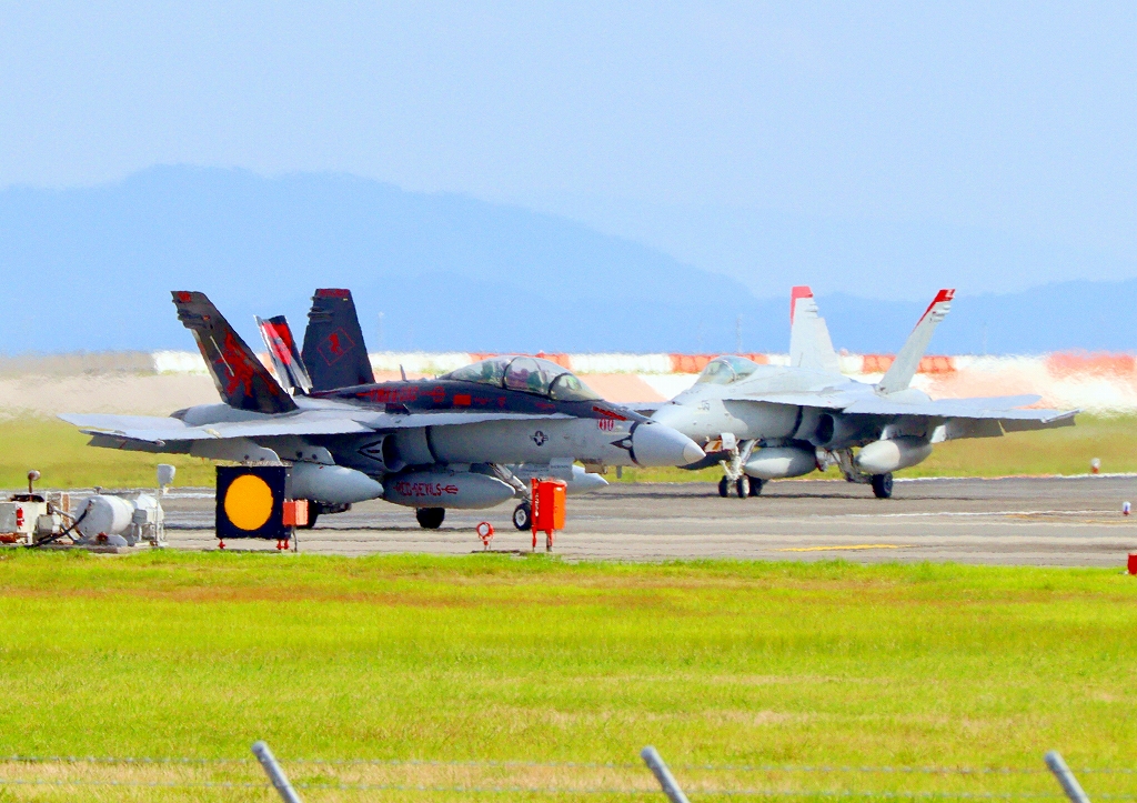 米海兵隊 F/A-18D/C ホーネット 戦闘攻撃機、WT、00番機、05番機が飛来、着陸