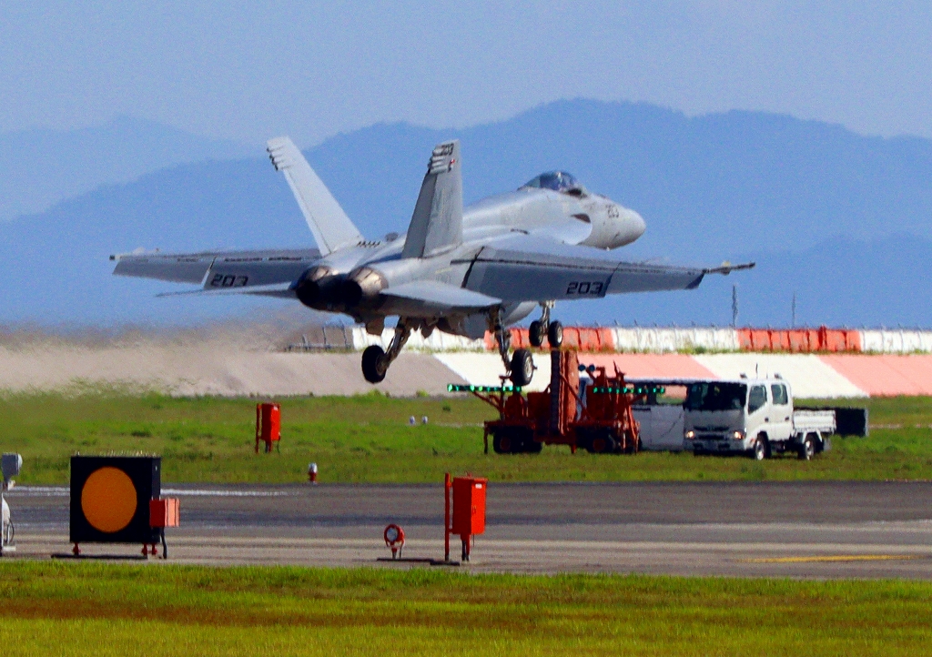米海軍艦載機 F/A-18E スーパーホーネット 戦闘攻撃機(岩国基地)、NF、203番機がタッチアンド・ゴーして旋回