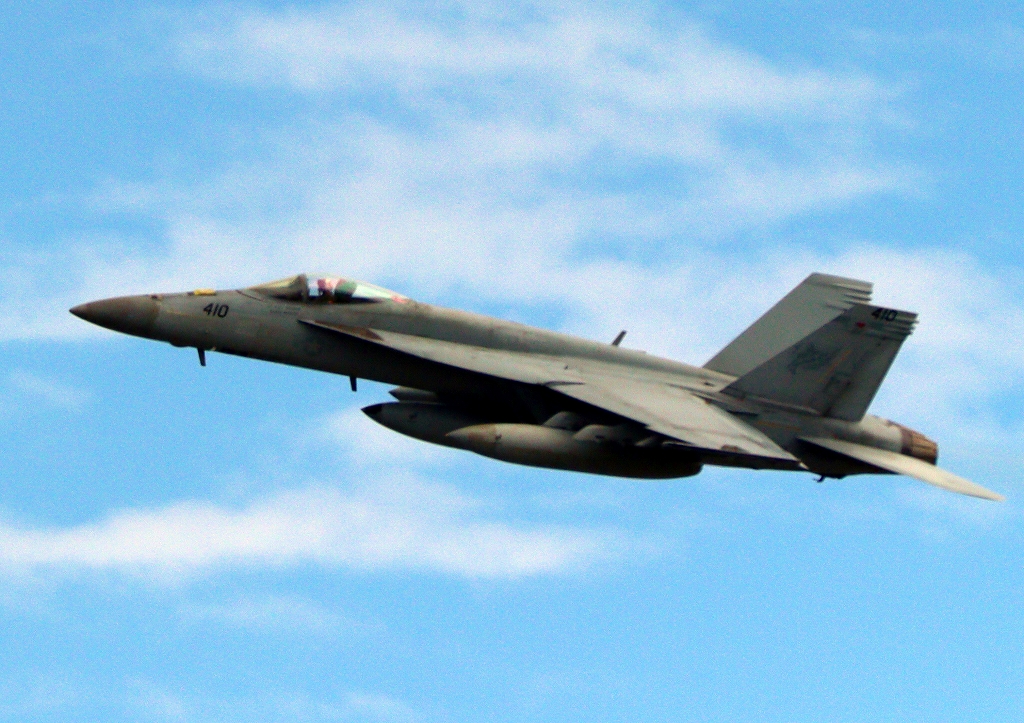 米海軍艦載機 F/A-18E スーパーホーネット 戦闘攻撃機(岩国基地)、NF、410番機が離陸