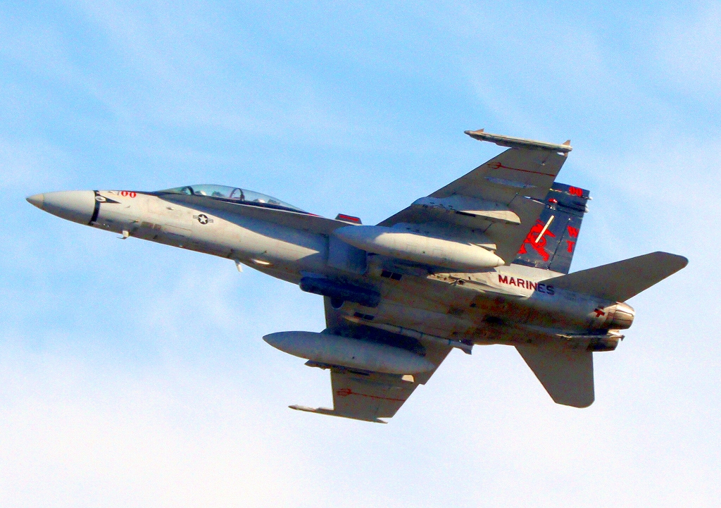 米海兵隊 F/A-18D ホーネット 戦闘攻撃機(岩国基地)、WT 00番機が離陸