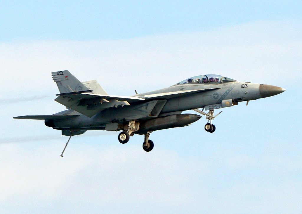 米海軍艦載機 F/A-18F スーパーホーネット 戦闘攻撃機(岩国基地)、NF、103番機が帰還。アレスティング・フック引っかけて緊急着陸
