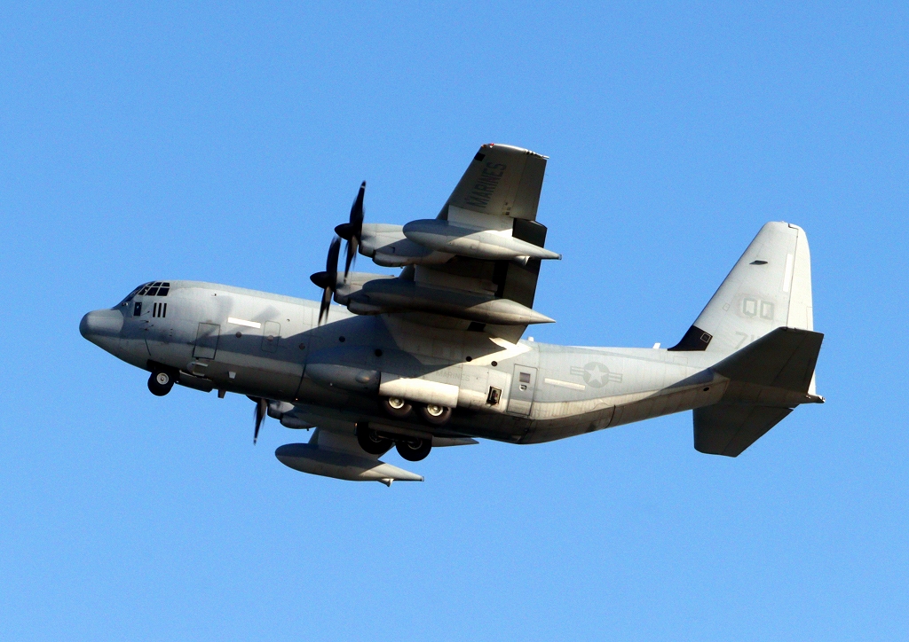 米海兵隊 KC-130J 空中給油機 スーパーハーキュリーズ(岩国基地)、QD 7111番機が旋回