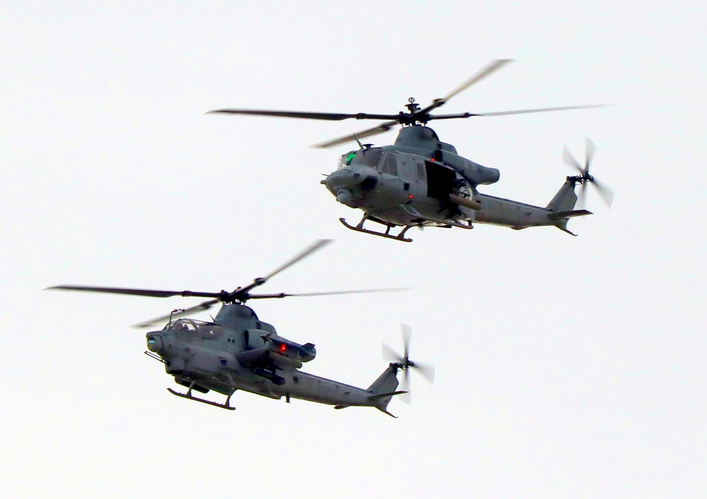 米海兵隊 AH-1Z 戦闘攻撃ヘリ バイパー、米海兵隊 UHー1Y 多用途へリ ベノム(普天間基地)が2機編隊で旋回