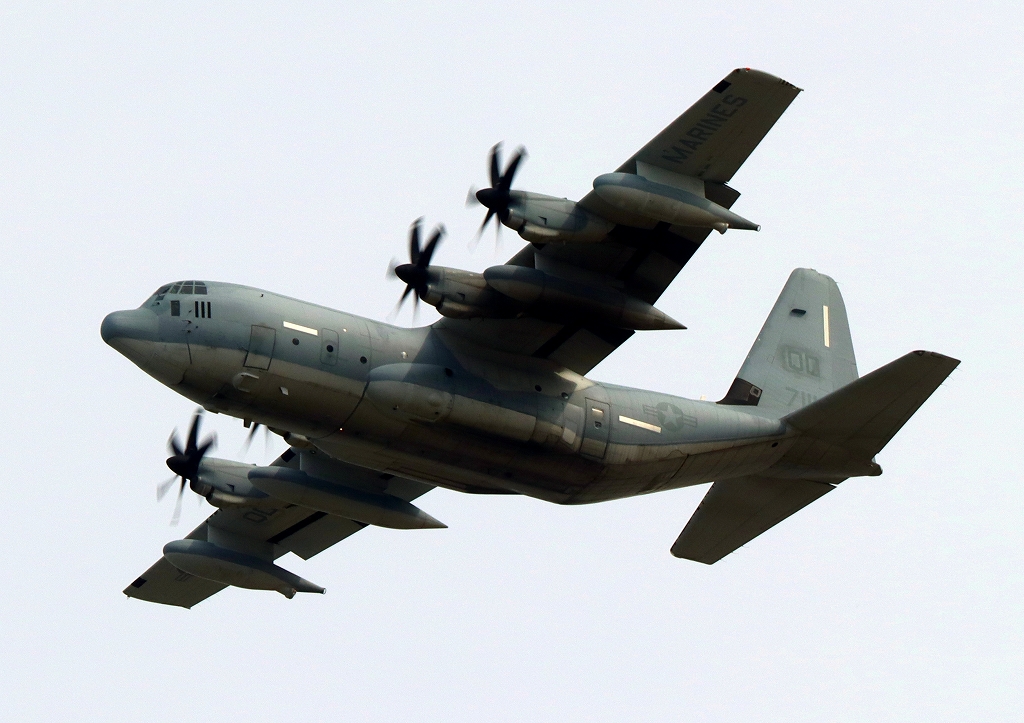米海兵隊 KC-130J 空中給油機 スーパーハーキュリーズ(岩国基地)、QD 7111番機が離陸