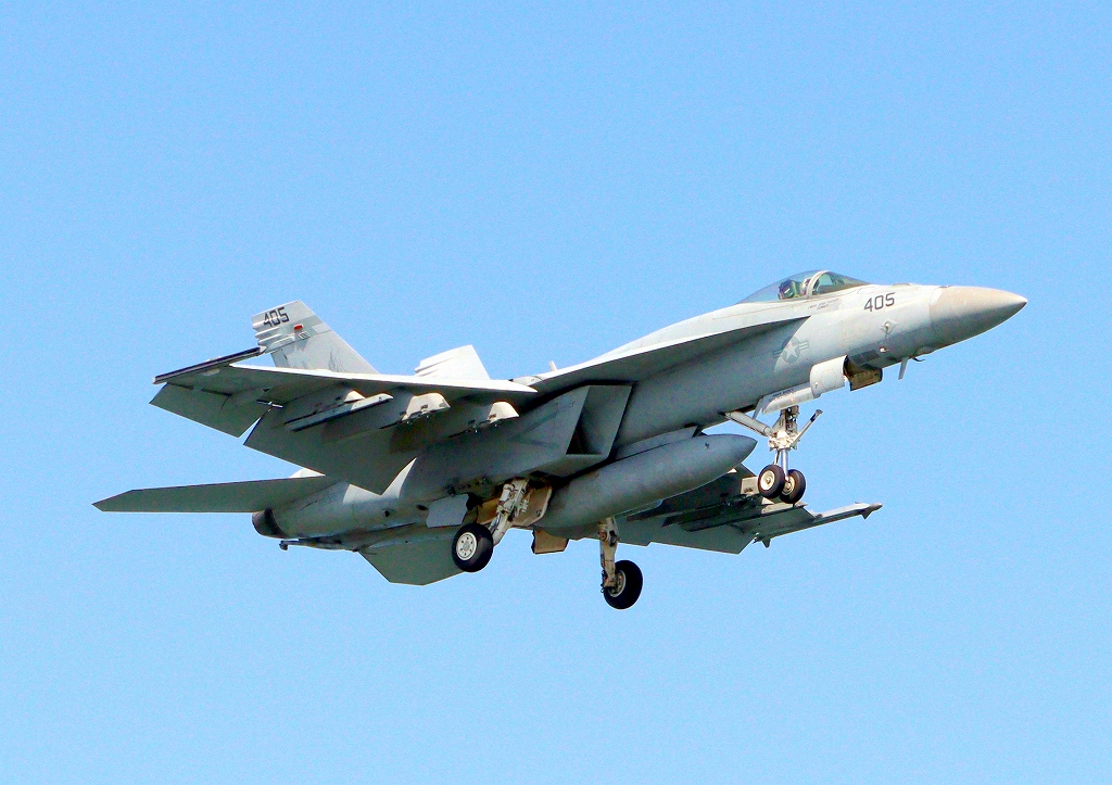 米海軍艦載機 F/A-18E スーパーホーネット 戦闘攻撃機(岩国基地)、NF、405番機が帰還、着陸
