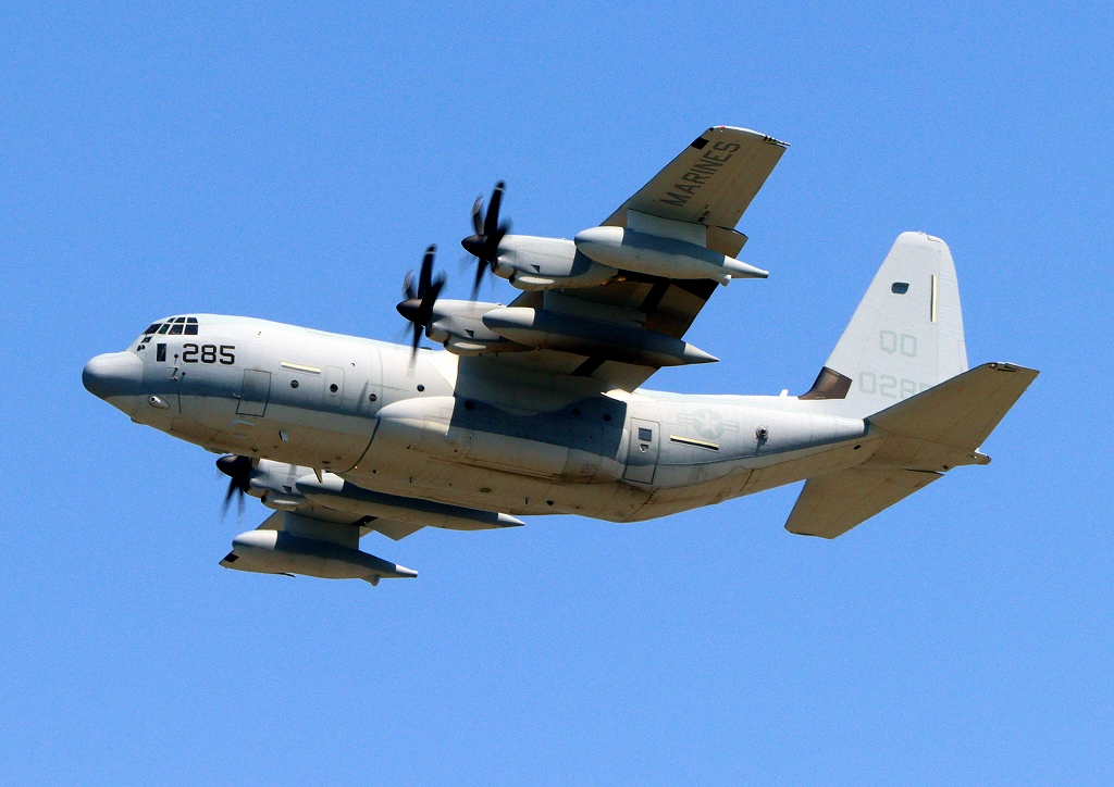 米海兵隊 KC-130J 空中給油機 スーパーハーキュリーズ(岩国基地)、QD 0285番機が離陸