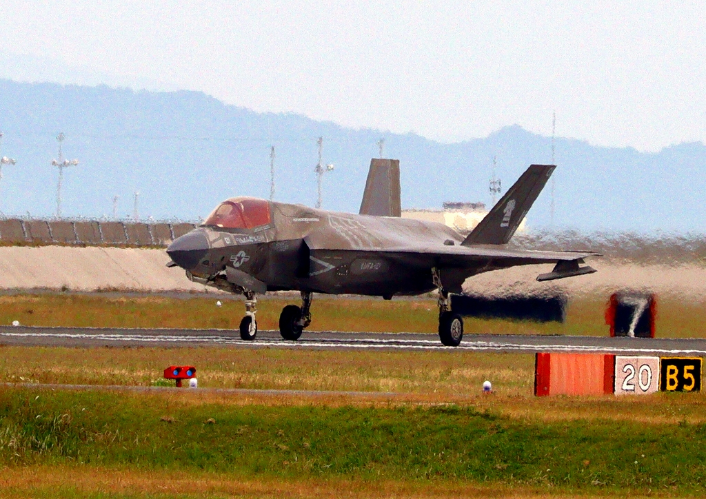 米海兵隊 F-35B ライトニングⅡ ステルス戦闘機(岩国基地)、VK、01番機が着陸。14時13分に離陸した機。52分間の飛行でした。