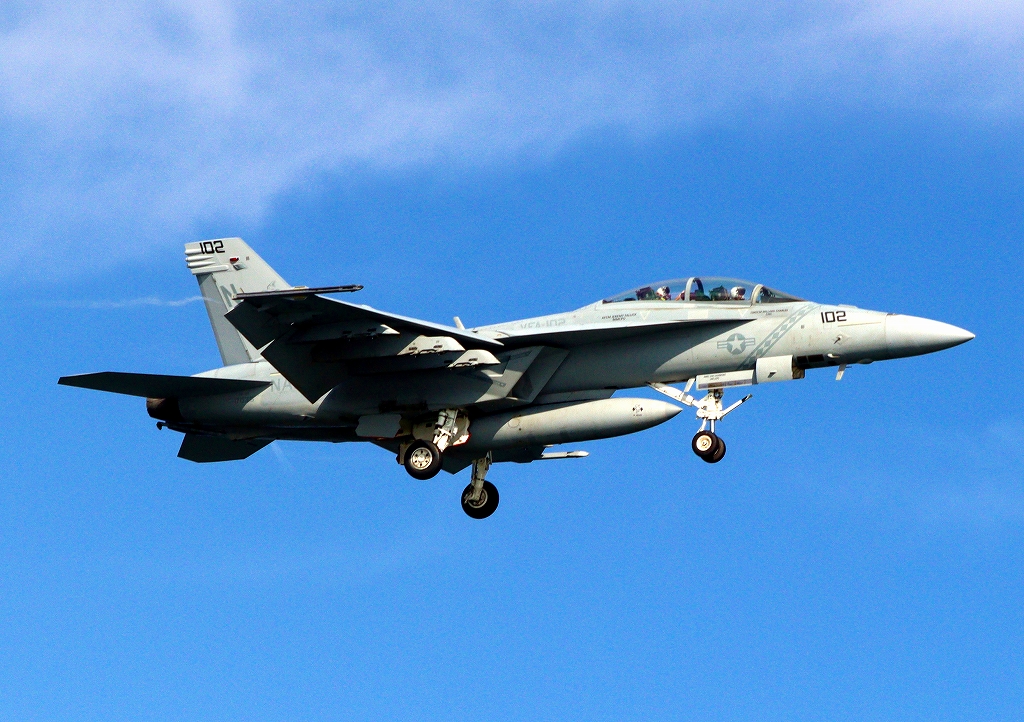 米海軍艦載機 F/A-18F スーパーホーネット 戦闘攻撃機(岩国基地)、NF、102番機が帰還、着陸