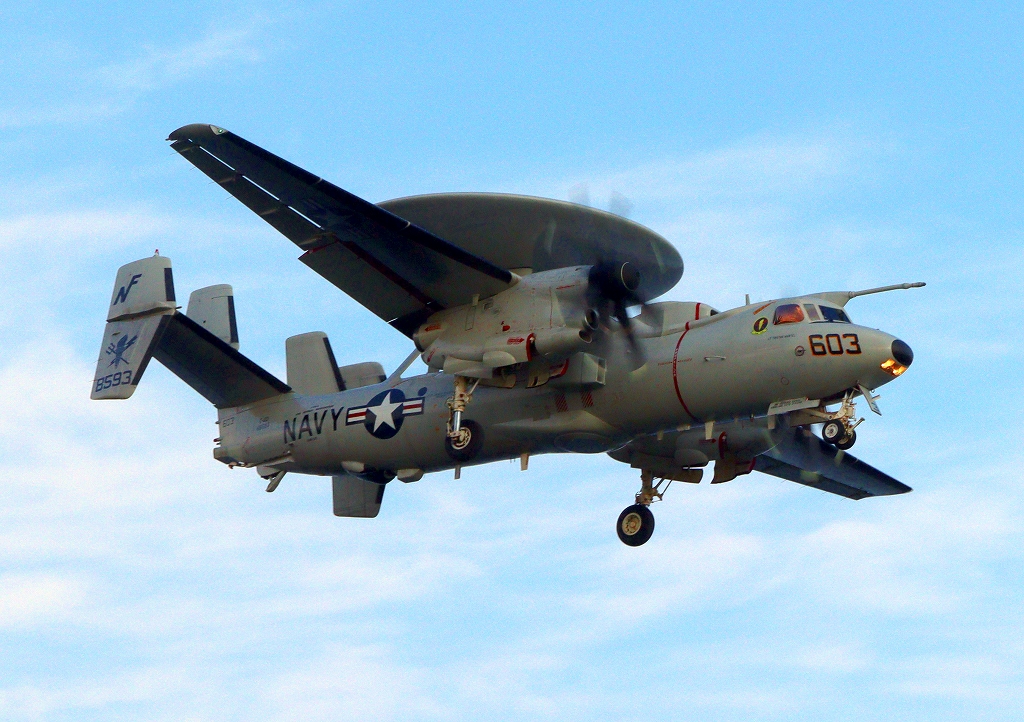 米海軍艦載機 E-2D アドヴァンスド・ホークアイ 早期警戒機(岩国基地)、603番機が帰還