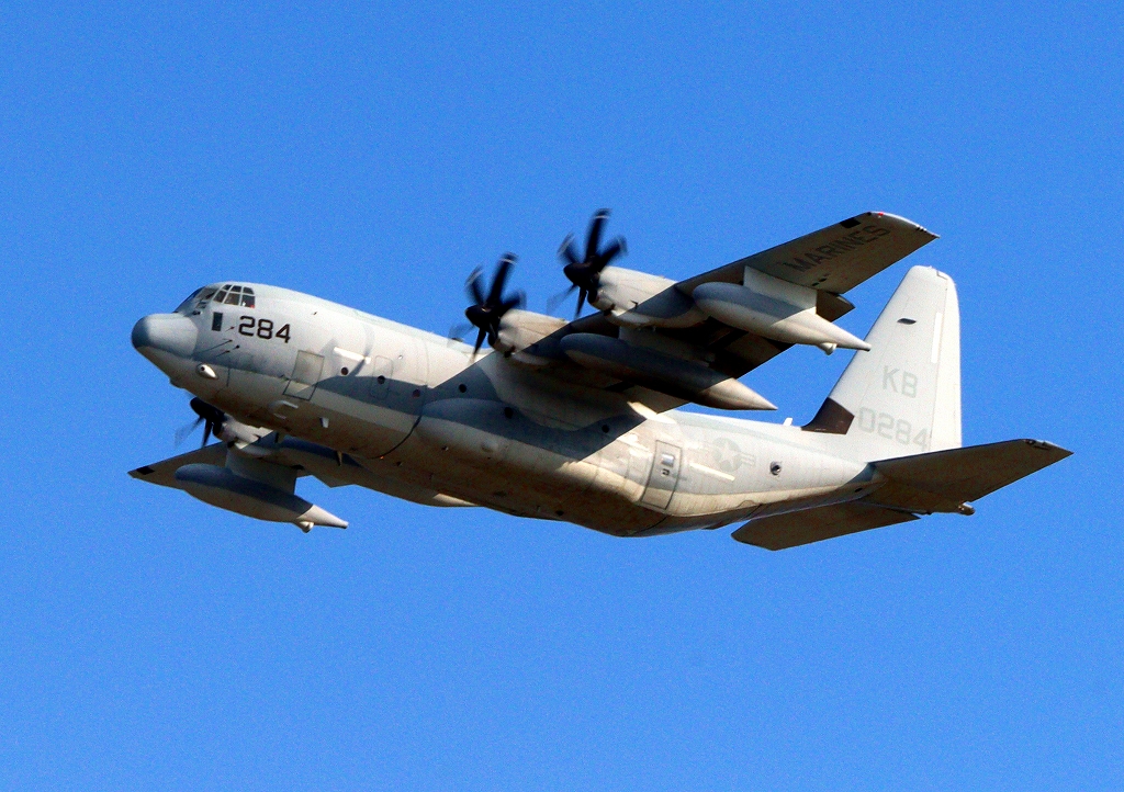 米海兵隊 KC-130J 空中給油機 スーパーハーキュリーズ(岩国基地)、QD 0284番機が離陸