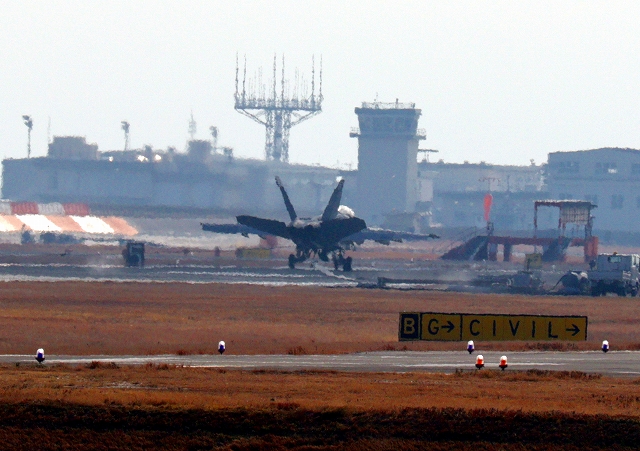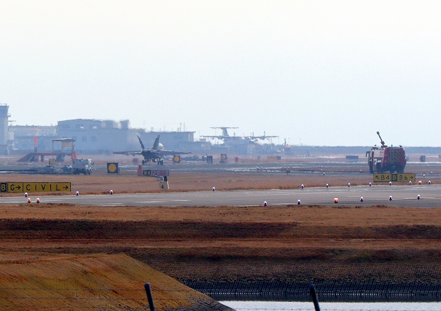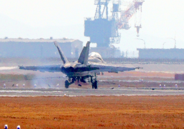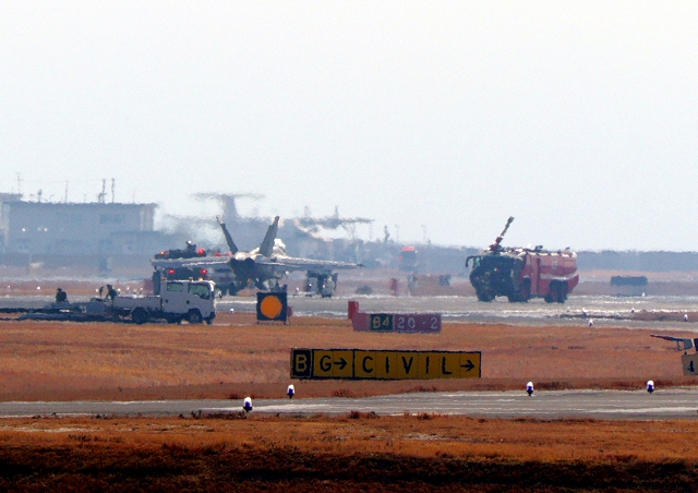 応急修理?は終わったようです。米海軍艦載機 F/A-18F スーパーホーネット 戦闘攻撃機(岩国基地)、NF、103番機は滑走路からでます。 |