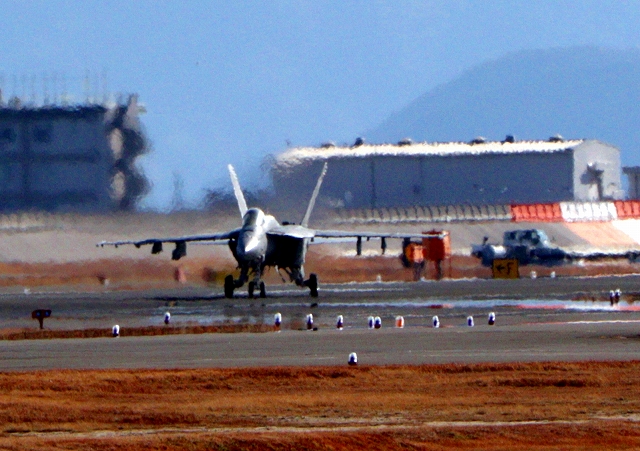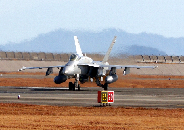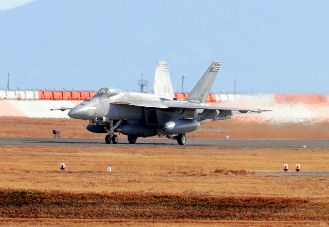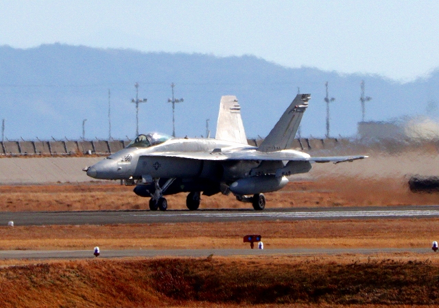 米海軍艦載機 F/A-18E スーパーホーネット 戦闘攻撃機(岩国基地)、NF、404番機が着陸 13時06分に離陸した機。1時間06分の飛行でした。 |