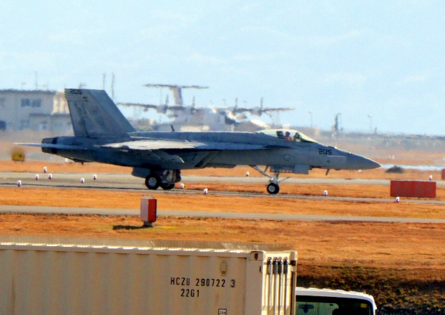 米海軍艦載機 F/A-18E スーパーホーネット 戦闘攻撃機(岩国基地)、NF、205番機が着陸 13時04分に離陸した機。1時間11分の飛行でした。 |