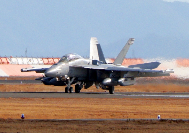 米海軍艦載機 F/A-18E スーパーホーネット 戦闘攻撃機(岩国基地)、NF、410番機が着陸 |