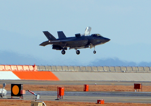米海兵隊 F-35B ライトニングⅡ 戦闘機(岩国基地)、DT、30番機が帰還、北の垂直着陸パッドの上でホバリング。 |