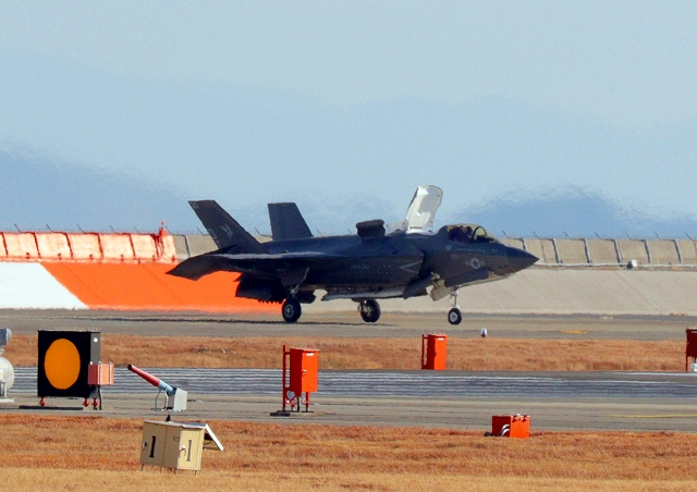 米海兵隊 F-35B ライトニングⅡ 戦闘機(岩国基地)、DT、30番機が北の垂直着陸パッドの上に着陸