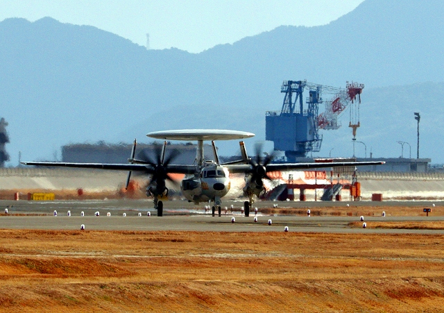 米海軍艦載機 E-2D アドヴァンスド・ホークアイ 早期警戒機(岩国基地)、600番機が着陸 |