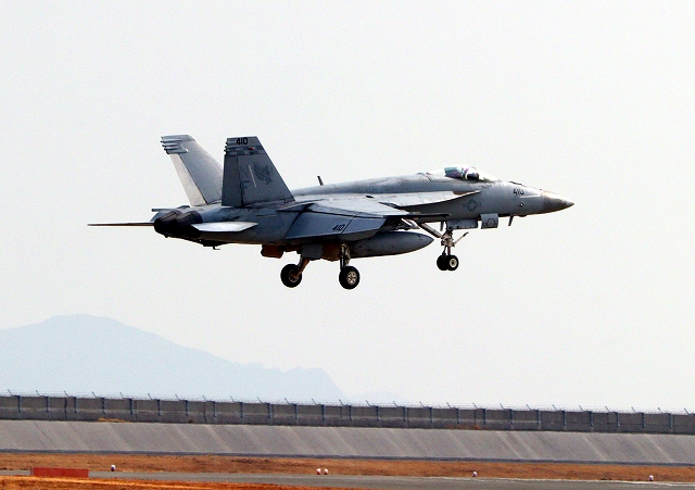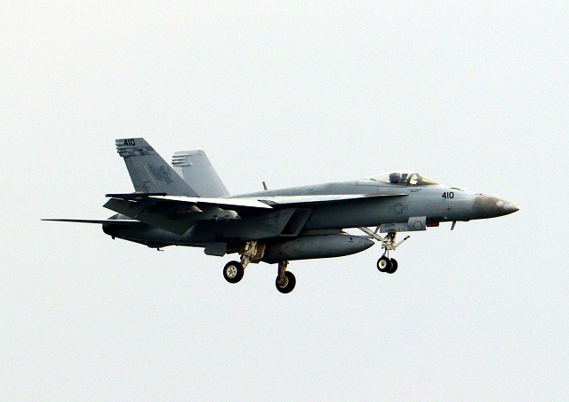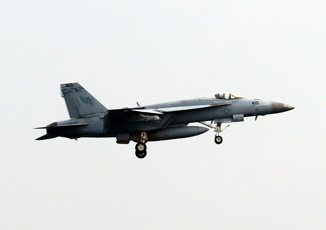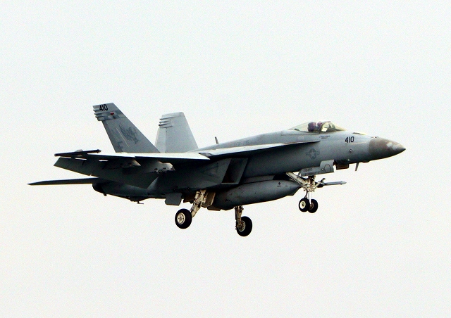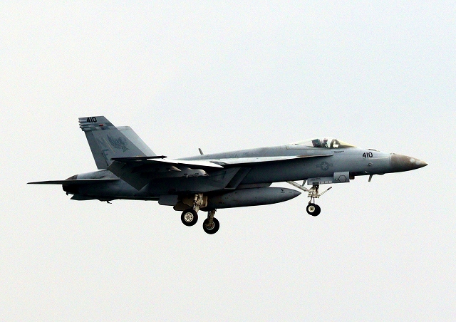 米海軍艦載機 F/A-18E スーパーホーネット 戦闘攻撃機(岩国基地)、NF、410番機が帰還 |