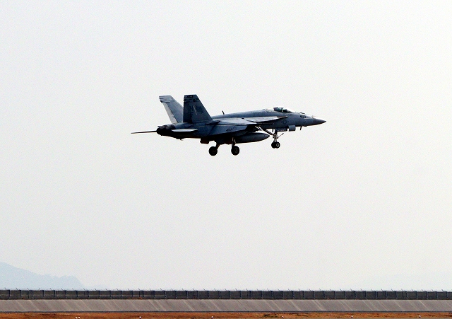 米海軍艦載機 F/A-18E スーパーホーネット 戦闘攻撃機(岩国基地)、NF、410番機が着陸 |