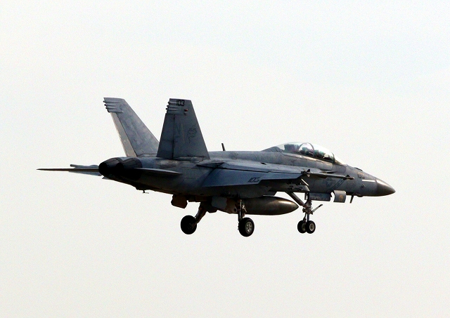 米海軍艦載機 F/A-18F スーパーホーネット 戦闘攻撃機(岩国基地)、NF、103番機が着陸