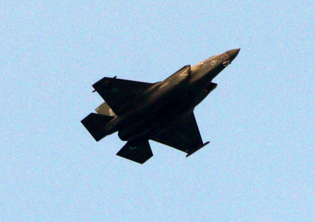 米海兵隊 F-35B ライトニングⅡ 戦闘機(岩国基地)、VK、09番機は南側の垂直着陸パッドの上でホバリング、着陸 13時42分に離陸した機。54分間の飛行でした。 |