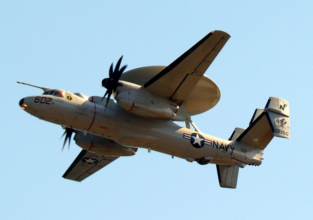 米海軍艦載機 E-2D アドヴァンスド・ホークアイ 早期警戒機(岩国基地)、602番機が旋回 |
