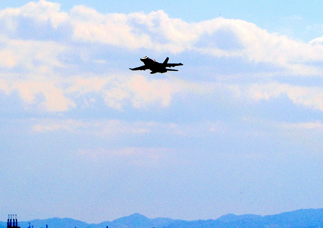 米海軍艦載機 F/A-18E スーパーホーネット 戦闘攻撃機(岩国基地)、NF、406番機が離陸 |