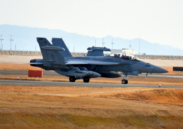 米海軍艦載機 EA-18G グラウラー 電子戦戦闘攻撃機(岩国基地)、NF、507番機が着陸 12時35分に離陸した機。1時間20分の飛行でした。 |