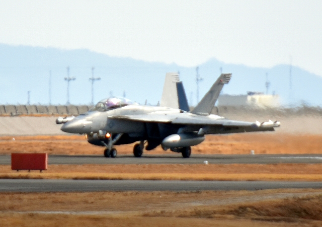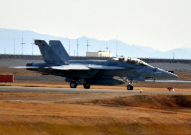 米海軍艦載機 F/A-18E スーパーホーネット 戦闘攻撃機(岩国基地)、NF、411番機が着陸 12時37分に離陸した機。1時間26分の飛行でした。 |